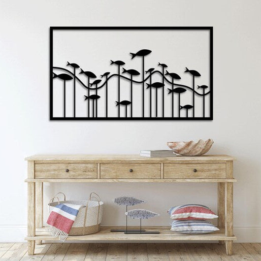 The Swim” is a wall art piece crafted from painted iron, featuring a school of fish in elegant motion. The multi-height arrangement gives the artwork depth and fluidity, creating a sense of underwater harmony. A perfect piece to bring life and movement to modern interiors with a marine-inspired touch.